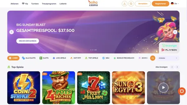 Bei Boho Casino setzen wir auf Klarheit: viel Spielauswahl, transparente Regeln und Zahlungsoptionen, die dazu passen, wie Spieler in Deutschland am liebsten einzahlen und auszahlen. Unser Hauptfokus ist Ausgewogenheit: eine sehr große Lobby, hilfreiche Filter wie „Hot-RTP“ und flexibles EUR-Banking an einem Ort.